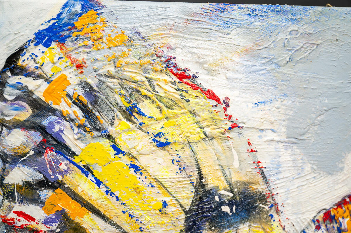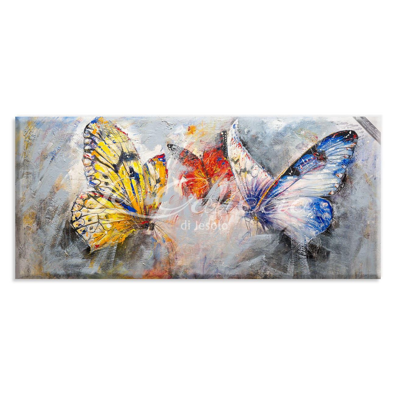 Un'opera d'arte moderna e dinamica dove la texture è protagonista. Le farfalle sono rese con un notevole effetto tridimensionale grazie all'uso sapiente della pittura a spessore, che ne evidenzia le venature delle ali. Lo sfondo grigio-azzurro, trattato con velature e spruzzi astratti, permette ai colori brillanti delle farfalle di risaltare con forza.